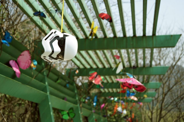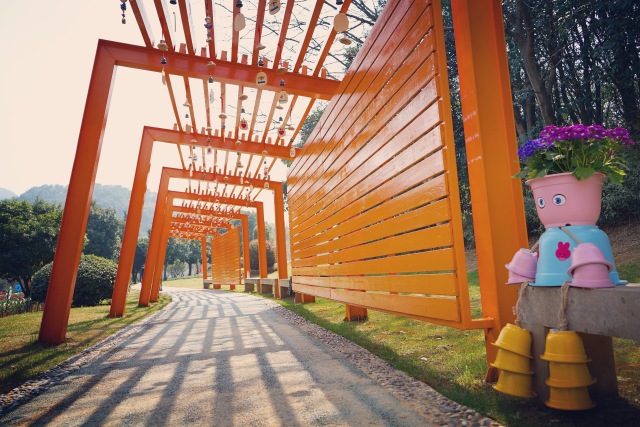 左手邊的紫藤廊架上五彩繽紛的仿真蝴蝶、蜻蜓和小鳥(niǎo)俏皮地停在枝頭,讓你仿佛置身小森林,一張張可愛(ài)搞怪的面具懸掛其中,等待你的互動(dòng)。