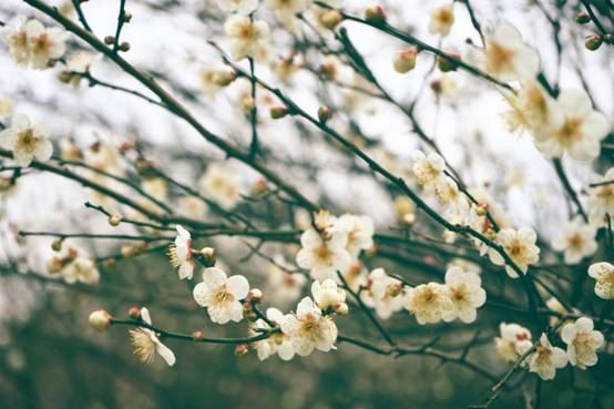 白梅星星點(diǎn)點(diǎn),潔白無(wú)瑕,柔軟的花瓣輕托著嫩黃色的花芯,楚楚動(dòng)人。