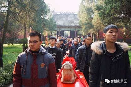 早上9時18分,在鑼鼓聲中,百余人著正裝,抬著牛、羊、豬頭,五谷雜糧,水果等祭品,從守陵村出發,手舉姒族祭禹旗幟,浩浩蕩蕩前往大禹陵禹廟大殿祭祀。