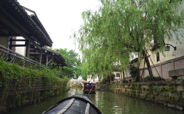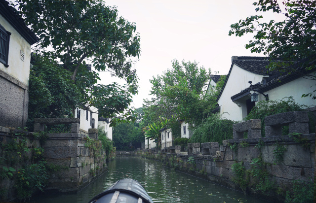 沿著頭頂?shù)臉?shù)枝望向兩岸,白墻黑瓦,郁郁蔥蔥,石塊切成的河沿,石板砌成的小道,一路探尋的是粉墻黛瓦的歷史,聆聽(tīng)到的是斑駁白墻的故事。
