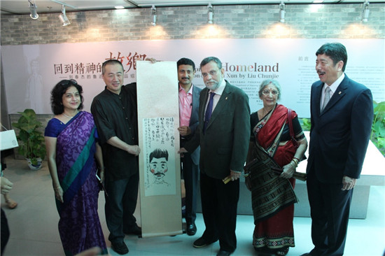 座談會后,雙方代表參觀了正在紹興魯迅紀念館展出的“回到精神的故鄉”——劉春杰魯迅視界作品展”,中國當代版畫藝術家劉春杰先生將自己在昨晚連夜創作的一副魯迅肖像水墨畫贈送給了參加大師對話的泰戈爾后代。