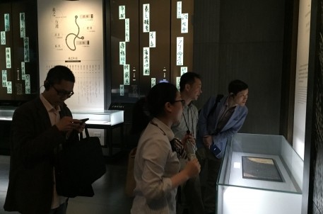 5月20日上午,玉環(huán)縣副縣長胡載彬帶領(lǐng)縣文廣局相關(guān)工作人員一行6人到蘭亭景區(qū)學習考察,胡縣長此行主要目的是學習蘭亭書法博物館在建中的一些經(jīng)驗做法,特別是在陳列文本、設(shè)計和施工等方面的經(jīng)驗。一行6人先后參觀了古跡區(qū)、蘭亭書法博物館、徐渭感映藝術(shù)大展和歷屆蘭亭獎書法作品展,并向工作人員詳細了解了博物館從文本起草到最后呈現(xiàn)過程的每個細節(jié)。