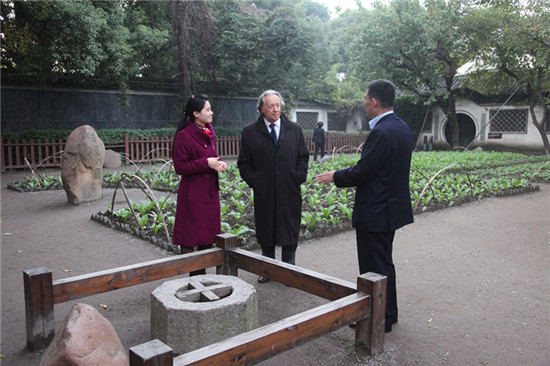 在景區講解員的陪同下,馬達羅對三味書屋、百草園等魯迅少年時代的生活場所細觀詳矚。當走到三味書屋門前的小河邊時,馬達羅饒有興趣地低頭觀望:一艘艘烏蓬小舟在細長狹窄的河道之上欸乃而過,河邊就是粉墻黛瓦的紹興臺門。馬達羅表示,這是他對紹興的最初印象,如今再見,感覺分外親切。