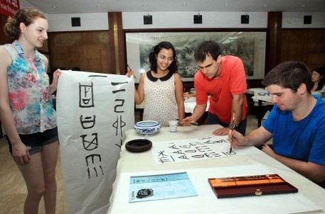 參加此次短訓班的十位學生雖然來自不同的國家,漢語水平也比較有限,但對中國博大精深的書法文化都十分崇拜,對結繩記事、倉頡造字等書法故事都很感興趣,而且每個人還取了朗朗上口的中國名字:白玫、司杰明、安小荷……。課堂上,他們聚精會神的按照蘭亭書法博物館館長喻革良老師的指導,從握筆、上墨、入畫、提勾到點、橫撇、捺,從陌生、緊張到輕松、愉快,或許這正是書法藝術植入人心的真正魅力所在。