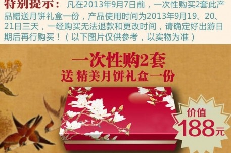 2013年中秋節將至,為吸引更多游客到古城紹興游玩,游客中心電子商務部積極與天貓聚劃算洽談合作,推出了中秋套餐:江南中秋月——紹興古城雙人雙早自由行套餐。內容包括四點聯票及紹興世茂假日酒店高級標準間一晚(含雙人雙早)。 同時為了增加節日氣氛,讓游客在紹興度過一個難忘的中秋,我們還特別推出了購套餐產品送月餅活動,即一次性在古城天貓店購買兩個中秋自由行套餐產品的用戶均可獲贈精美月餅禮盒一份。該活動將持續到2013年9月7日。(張艷紅)