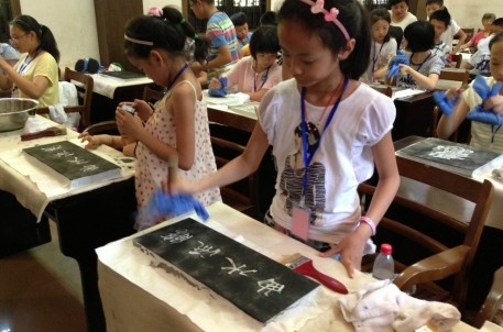 活動中,同學們在講解員的帶領下先參觀了“蘭亭八景”,與大白鵝合影,在十八缸臨字,之后還饒有興致的參加了書法描紅和仿古的曲水流觴演藝活動,午飯后,還在景區工作人員的悉心指導下學習拓碑技藝。湖州市少年宮一行學生均有一定的書法基礎,對于書法結構、書法基礎知識有一定的掌握和了解,此次來蘭亭景區實地膜拜,可謂是理論聯系實踐最有效的結合。帶領劉老師說‘當他提出要帶孩子們出去夏令營時,孩子們不約而同的說要來蘭亭走走看看,可見,《蘭亭序》的書法魅力,蘭亭作為書法圣地的地位已經深入每一個書法愛好者的心里。’