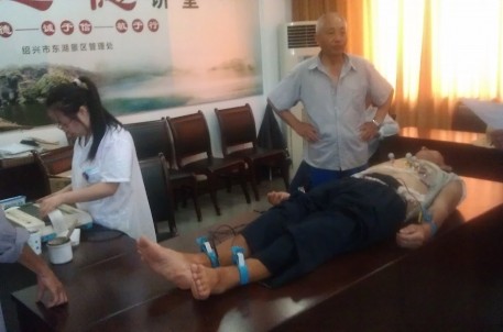 連日高溫,為保障船工的身體健康,確保景區烏篷船的安全作業,7月2日,東湖景區特別邀請皋埠鎮中心衛生院醫生來我景區對全體船工進行了包括心電圖、血壓、視力等內容的一次全面體檢。