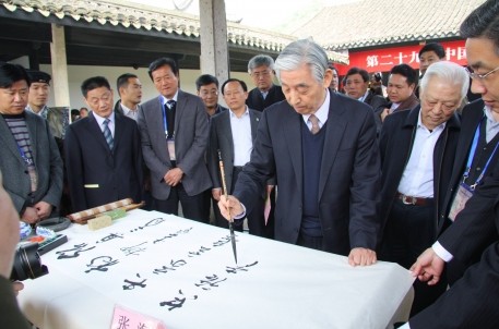 開幕式由市委副書記、代市長俞志宏主持,市委書記錢建明,中國書協分黨組書記、駐會副主席趙長青先后致辭。致辭結束后,中國書協主席張海向紹興市人民政府授予中國書法蘭亭獎長期承辦地匾牌,故宮博物院副院長王亞民介紹了故宮博物院和紹興市人民政府聯合出版解《蘭亭書法全集》的情況。最后,周鐵農宣布第二十九屆中國蘭亭書法節開幕。開幕式結束后,張海為本屆書法節開筆,在墨華亭揮毫寫下“紹興三月,楊柳春風,大家云集,共話蘭亭”幾個大字,隨后,與會書法家代表參加了書藝交流和仿古曲水流觴活動。