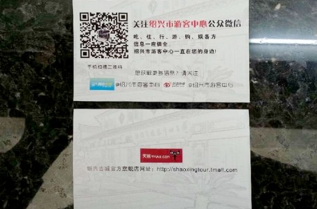 一、制作微信名片。將“紹興市游客中心”微信二維碼印成名片,并附上游客中心新浪微博、騰訊微博賬號,天貓古城旅游旗艦店網址等相關信息。制成的名片主要投放于游客中心各個窗口,方便游客取閱、掃描。
