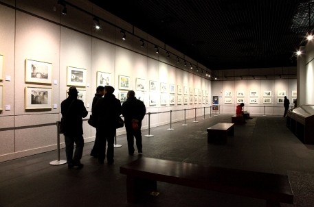 2012年12月29日,寒風凜冽,雨雪如磐,這是紹興今年入冬以來的第一場雪。紹興博物館越王城館正大門,豎立著大幅的藍色宣傳海報,海報注寫:橋·楊明義百橋圖展。上午是一個簡短而隆重的開幕式,市領導出席了畫展開幕式,楊明義百橋圖展正式拉開帷幕,畫展將持續至2013年4月1日。博物館特為楊明義畫作單辟展廳。展廳內燈光如炬,一百多張水墨畫整齊懸掛于墻壁上。最先入眼的是《八字橋,古橋中的瑰寶》《朝輝》《古橋秋霧》《月夜題扇橋》四副水墨畫。細看,是紹興的八字橋、太平橋、探花橋和題扇橋。如果細數,在展出的100多幅作品中,有40多座橋,皆是紹興之橋。畫展吸引了眾多畫家和書畫愛好者前來觀摩。