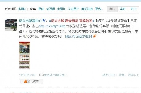 即日起至1月20日止,轉發紹興市游客中心新浪微博即有機會贏得價值50元的春節期間(2月8日至2月14日)“古城自由行套餐”抵用券,共設有100個名額。活動剛一推出,便獲得了微博粉絲的熱烈響應,訪問、轉發率爆增至平時的幾倍。 此次活動的推出意在通過微博推廣新開張的“紹興古城旅游天貓旗艦店”,增加網店知名度,也為集團春節長假產品宣傳造勢。同時,本次活動也標志著2013年網絡營銷正式啟動。(何琦)