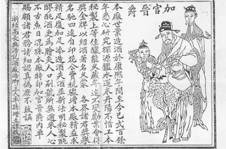 酒坊把煎煮好的酒裝壇后,用竹箸包緊壇口,放上圖文并茂的坊單,再安上泥質(zhì)蓋,然后敷以黃泥封壇。經(jīng)過(guò)貯存,當(dāng)人們開(kāi)啟黃泥封土,即能見(jiàn)到詳細(xì)介紹黃酒的坊單。這里介紹一張清代康熙年間紹興高長(zhǎng)興浩記酒廠坊單(見(jiàn)圖)。名為“加官晉爵” 坊單圖。現(xiàn)把坊單中文字抄錄如下: