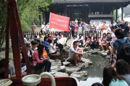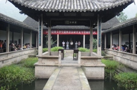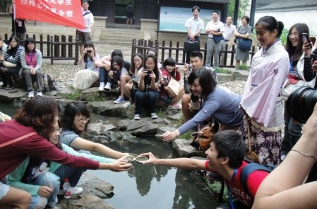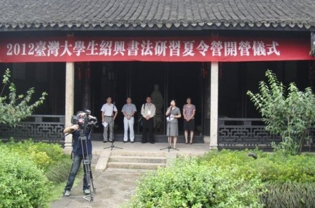 8月23日上午,2012年臺灣大學生紹興市書法研習夏令營在蘭亭景區(qū)王右軍祠開營。參加開營儀式的有國臺辦、省臺辦、市臺辦、蘭亭書法學院領導和來臺灣大學生、紹興文理學院大學生等。在開營儀式上,市臺辦領導致歡迎詞,書法學院領導授夏令營營旗,學生代表講話。開營儀式結束后,臺灣大學生饒有興趣的參加了景區(qū)為其精心準備的曲水流觴和臨池十八缸學書活動。在曲水流觴處,兩岸學子紛紛飲酒作詩、唱歌,氣氛活躍,充分展示了當代大學生多才多藝的風采。在臨池十八缸處,學生們拿起毛筆金磚習字,領悟“吾兒練盡三缸水,唯有一點像羲之”的典故內涵。