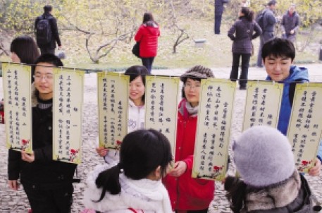 臘梅暗香浮動(dòng),古詩隨風(fēng)搖曳……新年的沈園是如此詩情畫意。為迎接2012年的到來,元旦小長假期間,景區(qū)在古跡區(qū)梅林掛滿了140多首陸游詠梅詩,讓游人們?cè)谫p梅的同時(shí)可以詠梅吟詩,感受了濃濃的紹興風(fēng)情。