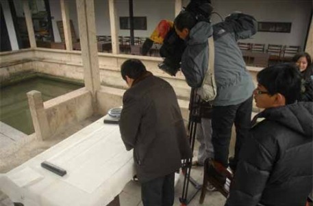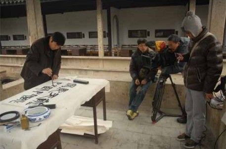12月15日至16日,蘭亭景區接待了中央電視臺的攝制組。據導演介紹,他們在為臺北故宮博物院拍攝專題,專門介紹臺北故宮的100件珍貴藏品,其中有一件與蘭亭有關,是定武本《蘭亭序》真跡。為此,攝制組不遠千里,追蹤到了紹興蘭亭。拍攝主要從《蘭亭序》的產生和《蘭亭序》在中國書法史上的地位這兩個角度切入,攝制組表現出了非常認真、嚴謹、專業、敬業的工作態度,即使一個靜態的鏡頭也要反復選擇、錄制、比較,力求盡善盡美。在拍攝過程中,蘭亭景區副主任、知名書法家喻革良和景區多位工作人員也協助和參與其中,喻革良老師為了拍好梁武帝評價王羲之書法 “龍跳天門、虎臥鳳闋” 這八個字,就反復書寫了很多張。拍攝完畢時,他把最滿意的一張作品蓋上章送給了攝制組,讓導演異常興奮,一直感嘆不虛此行,并表示要把作品掛在工作室里,讓大家記住蘭亭之行。