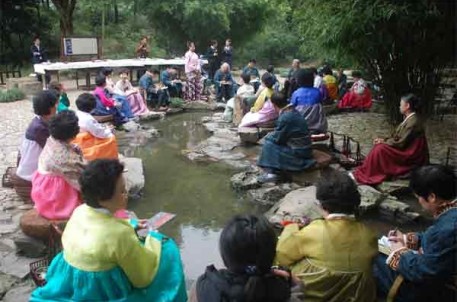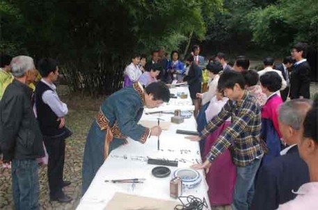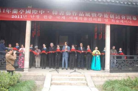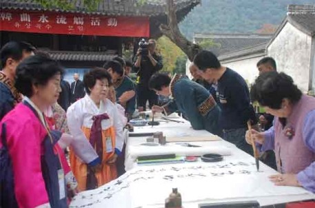 10月27日下午,由中國蘭亭書會、韓國世宗韓文書法協會共同主辦,蘭亭景區承辦的2011蘭亭中韓國際書藝展暨學術研討會在我景區舉行。來自中韓的40多書法家和書法愛好者、新聞媒體一起參加了開幕式,年近九旬的紹興著名老書法家郭子美也應邀出席。開幕式上,蘭亭書會會長謝有才、世宗韓文書協會長樸炳千分別致歡迎詞,并互贈了書法文獻資料。期間,還進行了隆重的剪彩儀式。開幕式后,中韓書家身著各自的特色服裝列坐曲水,效仿先賢,流觴雅集,飲酒賦詩,以書會友。最后,書法家們參加了中韓學術研討會,喻革良(中)、崔英姬(韓)等多位書家代表發表了自己的學術觀點和研究成果。