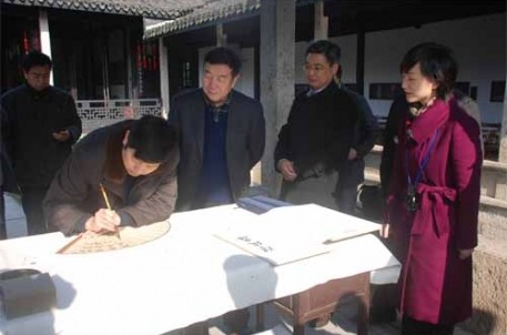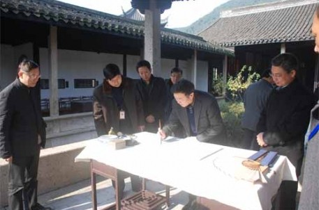 12月10日上午,北京故宮博物院院長鄭欣淼、副院長王亞民一行五人在紹興市副市長馮建榮,副秘書長、旅委主任、文物局長宣傳中、旅游集團總經理邵銘的陪同下考察了蘭亭景區。臨走之前,鄭院長在王右軍祠墨華亭題名留念,景區副主任、知名書法家喻革良現場題寫書法扇一把贈送給了鄭院長。鄭院長一行的考察對蘭亭來說意義重大。前不久,故宮剛舉辦過以“蘭亭文化”為主題的年度大展,屆時能否將蘭亭展引入紹興,令人期待。同時,故宮博物院眾多關于蘭亭、書法的珍貴藏品和先進的展陳方法,對蘭亭今后豐富陳列內容、提升陳列檔次都有著非常好的指導作用和借鑒、參考價值。最接近王羲之真跡的神龍本《蘭亭集序》真品就收藏于故宮博物院。