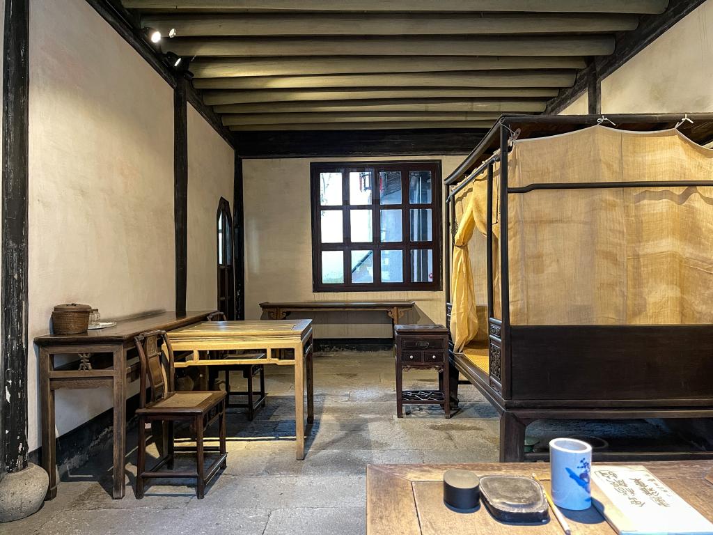 過了桂花明堂,便來到了魯迅的臥室。1909年夏,魯迅從日本留學歸國后,在杭州浙江兩級師范學堂教書。辛亥革命期間,他回到故鄉,先后在紹興府中學堂和山會初級師范學堂擔任教職。這是當時他在紹任教期間的臥室兼書房。魯迅常常在這里備課、寫作到深夜。他的第一篇文言小說《懷舊》就是在此寫成的。臥室里陳列著的一張鐵梨木床,系魯迅當年睡過的原物。