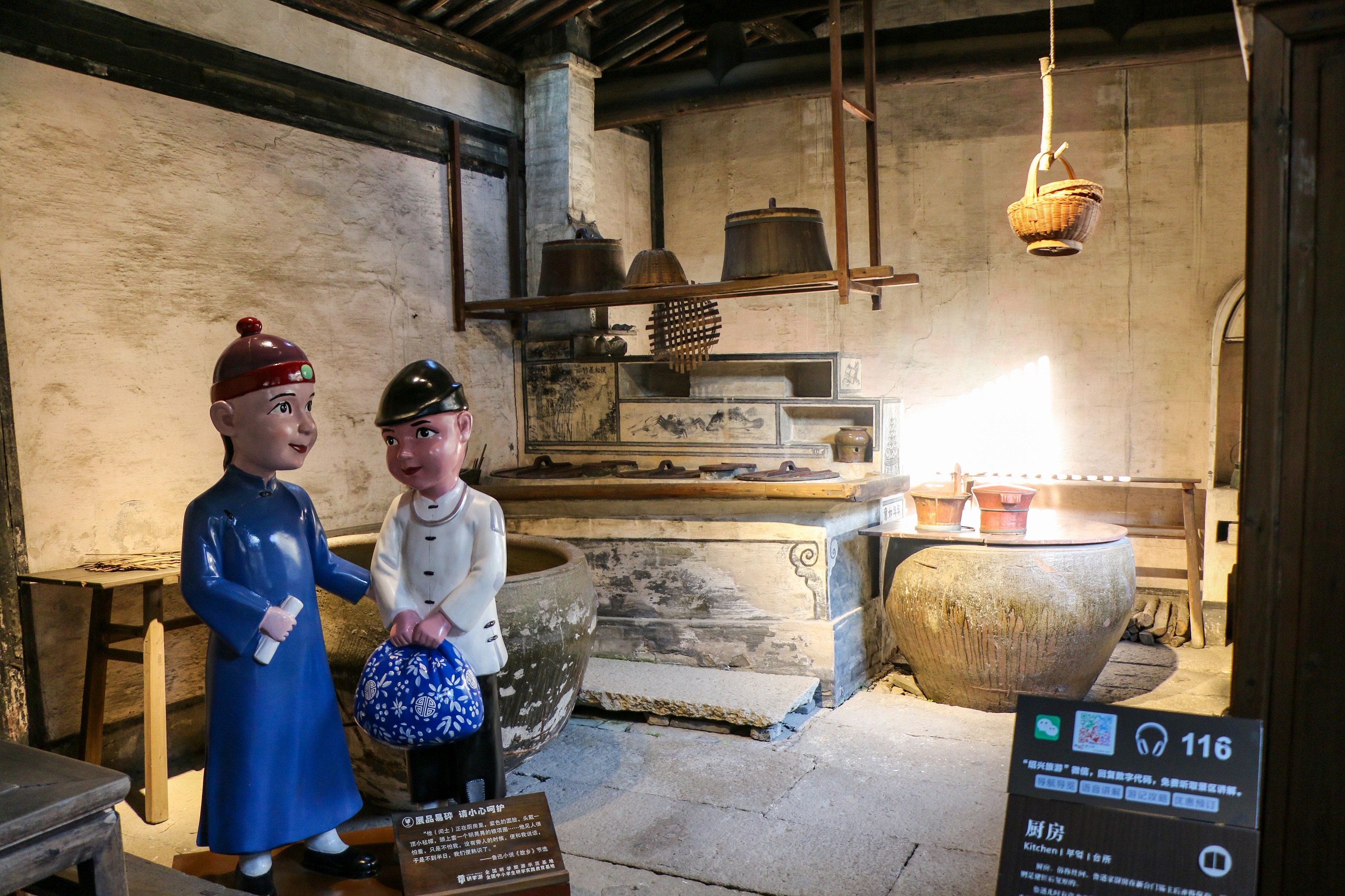 穿過故居西首的長弄堂,便來到了廚房。廚房里有一乘大戶人家用的三眼大灶,還陳列著八仙桌和其他炊具。壁上掛著一只很大的竹編菜罩,那是當年的“忙月”(季節工)章福慶為周家所做的原物。章福慶,浙江上虞杜浦村人,他除了做農活外,還有一手竹匠手藝。他經常到周家來做忙月,如種地,曬谷,修制竹器家具等。他曾為少年魯迅做過一些竹器玩具,魯迅十分喜愛。活忙不過來時,章福慶便將兒子章運水帶來幫忙。章運水和小魯迅年紀相仿,“紫色的圓臉,頭戴一頂小氈帽,頸上套一個明晃晃的銀項圈”。魯迅就是在這廚房里和他初次見面,成為好朋友的。運水教魯迅怎樣捕鳥,講述在海邊沙地里看管西瓜、拿胡叉刺猹的故事,是運水讓魯迅認識了一個在書本上見不到的陌生世界。1921年,魯迅在創作著名小說《故鄉》時,以運水為模特兒,塑造了“閏土”這個活生生的藝術形象。灶間北首,還有三間小房,這是在1981年紀念魯迅百齡冥誕時,經過認真考證后修復的。當年“忙月”章福慶在這里勞作、生活,東邊一間是他的住所。西邊一間是堆積間,里面存放著稻谷及牽礱、風車、竹簟、鋤頭等農具雜物。中間一間是過道,有門通向百草園。1918年底,經過新臺門周家六房共議,決定將整座新臺門連同后面的百草園,一起賣給東鄰朱姓。朱姓在購得新臺門后,大興土木,將新臺門連同他自己原有的住宅一起,改變原有結構,拆掉重新建造。因此,新臺門大部分房屋面目全非。萬幸的是,位于原臺門西面的魯迅故居的主要建筑未被改建,較為完好地保存了下來。2003年10月,新臺門改建部分作復原陳列,周家新臺門這座古色古香的深宅大院又展現在人們的眼前。