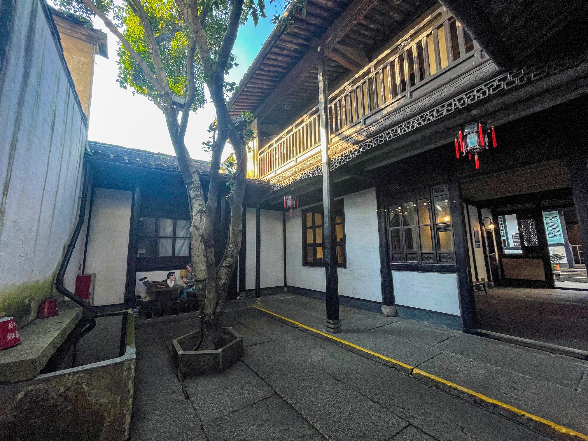 魯迅故居臨街兩扇黑油油的石庫臺門,原系周家新臺門的邊門,是魯迅家出入的地方。從黑色的臺門進去,穿過小天井,是一間泥地的臺門間,系魯迅家當年用來安放交通工具的地方,那里陳列著轎和櫓,其中轎杠系魯迅家的原物。從臺門斗側門進去,有一口水井,它亦是當年的遺物。穿過長廊,就到了桂花明堂。明堂俗稱天井,這里原種著兩株茂盛的金桂,桂花明堂即由此而得名。魯迅小時候,夏天經常躺在桂樹下的小板桌上乘涼,聽他的繼祖母蔣氏給他猜謎,講故事。