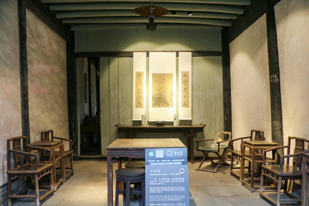 穿過天井,迎面就是保存完好的魯迅故居兩樓兩底。東首前半間是客廳,俗稱“小堂前”,是魯迅家吃飯、會客的地方。魯迅在紹任教期間,經常在這里接待來訪的朋友和學生。小堂前里除了桌椅外,還陳列著一張皮躺椅,這是魯迅父親周伯宜在患病時用以休息的原物。