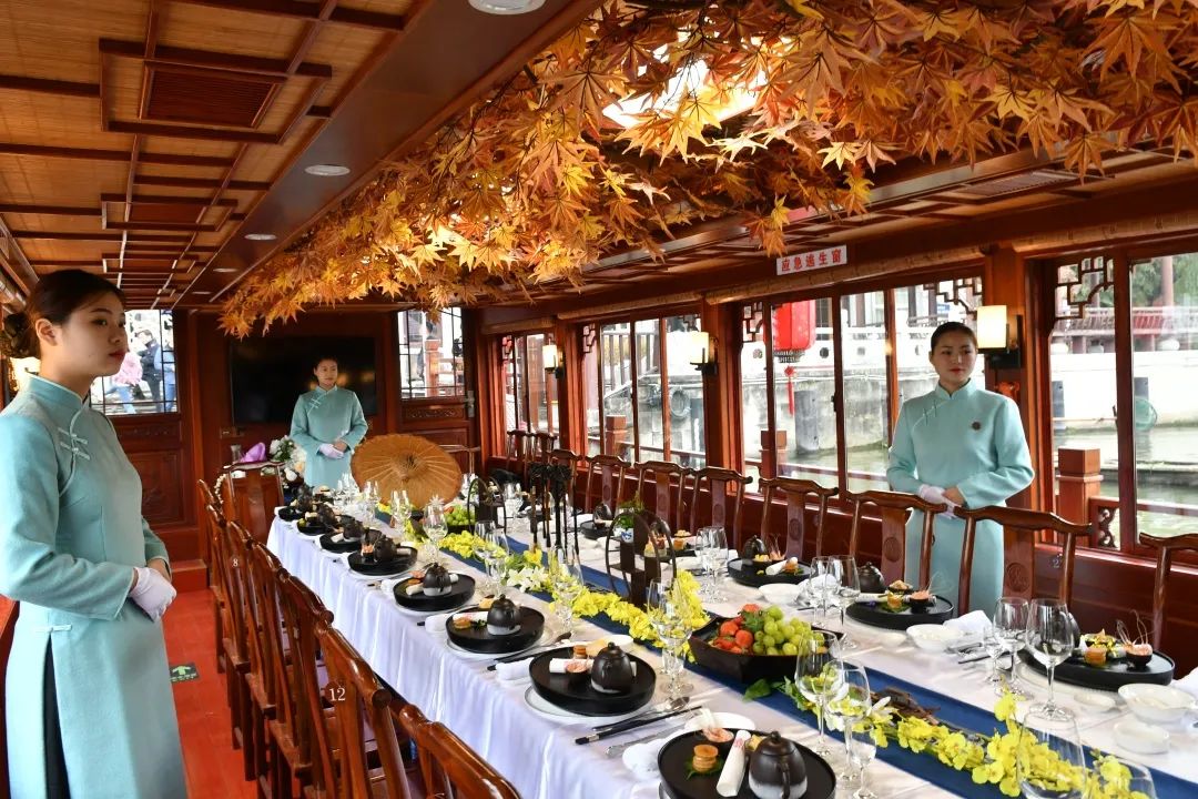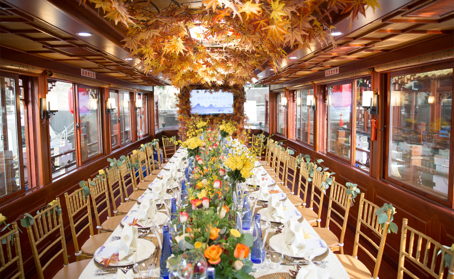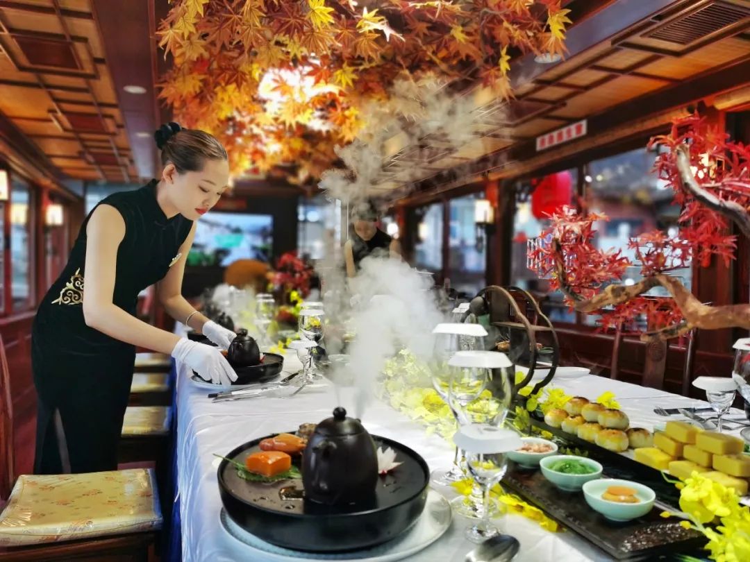 水城公司與東方御花園攜手,傾情推出水上船宴(需預(yù)訂),來招待四方食客。坐在古色畫舫里,可以與家人們一起,品船宴,賞夜色,望明月。興起時,還可以唱唱歌、聊聊天,聽聽越劇,與家人共度美好時光。