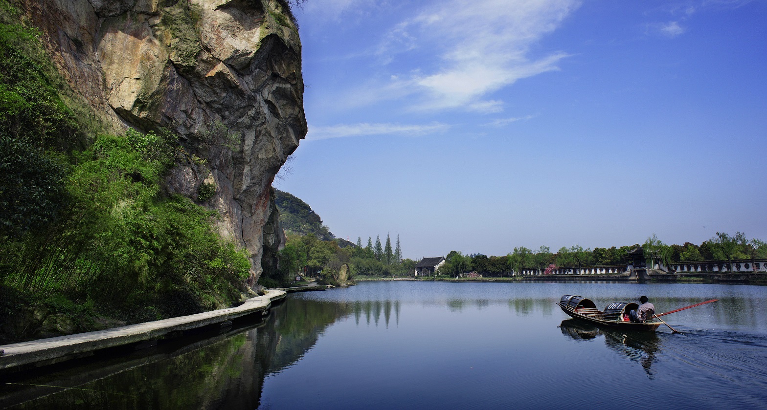 東湖,位于紹興城東5公里處,原為一座青石山,自漢代起石工相繼至此鑿山取石,經過千百年的鑿穿斧削,遂成懸崖峭壁,奇潭深淵。清光緒二十二年(1896年),陶淵明第45代孫,晚清著名書法家、教育家、園林藝術家——陶濬宣耗資8000銀元購得此地,以《桃花源記》為范本,精心布局園內的亭、臺、樓、閣,與崖壁、巖洞、石橋、湖面巧妙結合,歷時三年細致打磨,于1899年建成了美妙絕倫的東湖。