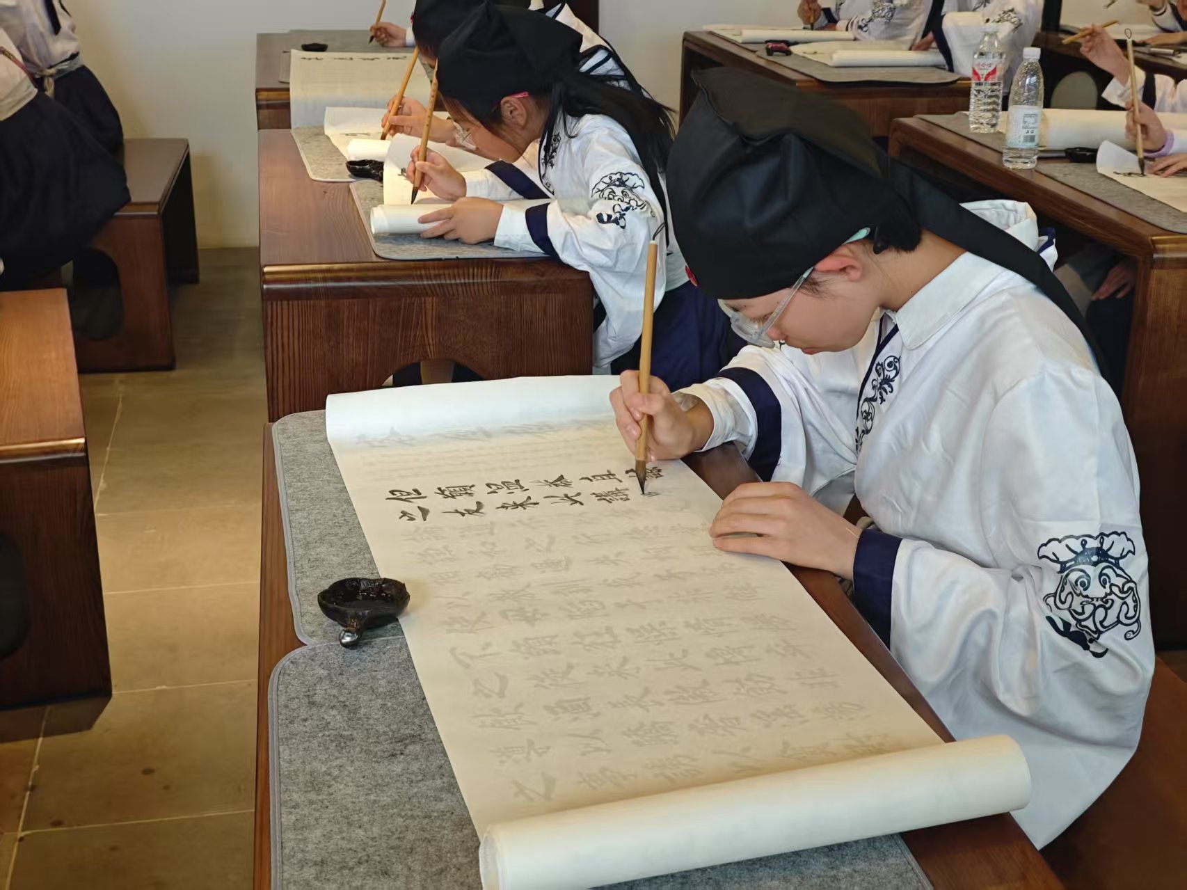 《客座私祝》是王陽明先生奉命征剿叛亂之際,對其子弟及來訪客人的殷切期望與告誡,強調了擇友之道、道德修養及家庭教育的重要性;同時也是先生為數不多留存于世的紙本楷書作品,展示了其精美的書法藝術。陽明故里特此推出“探墨《客座私祝》 感悟先圣教誨”研學游課程,旨在引領學生們穿越時空,聆聽陽明先圣的教誨,從中汲取智慧與力量,培養青少年正確的價值觀和道德觀念。