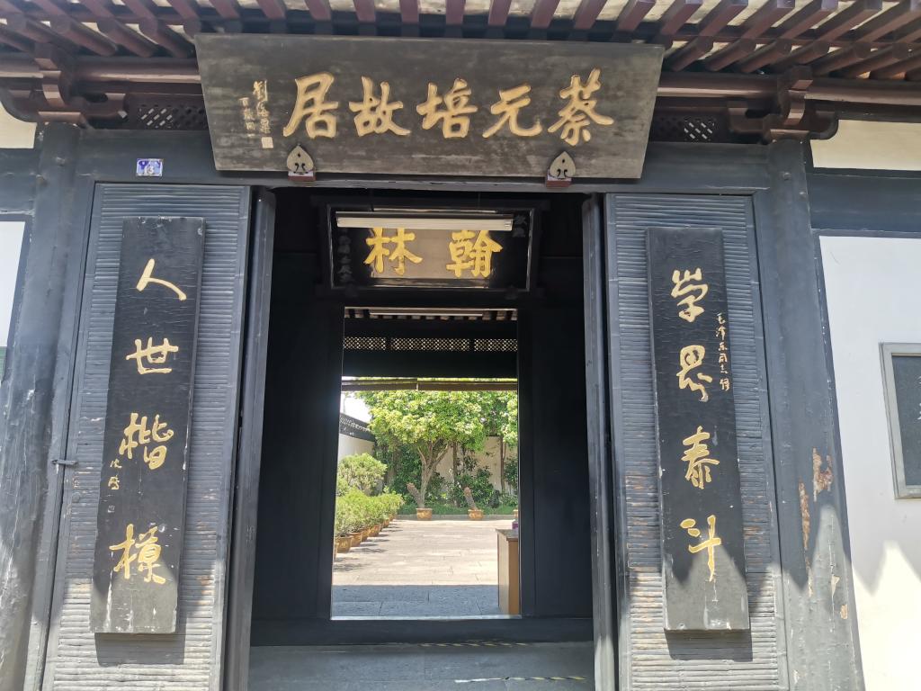 竹絲黑漆大門的門楣上懸掛匾額“蔡元培故居”,是由著名畫家、書法家、美術教育家、藝術大師劉海粟(1896~1994)101歲時題寫。兩側楹聯(lián)是毛澤東對蔡元培的贊譽:“學界泰斗,人世楷模”。屏門上則懸“翰林”匾額。