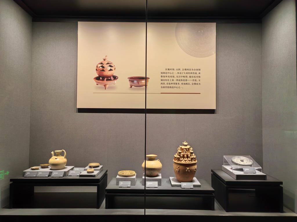 漢魏時期山陰、會稽兩縣是全國銅鏡制造中心之一,鑄造了大量的神獸鏡、畫像鏡和龍虎鏡。東漢中晚期,越窯成功燒紙出歷史上第一種成熟瓷器——青瓷。至兩晉,青瓷種類繁多,質地精良,會稽成為全國青瓷燒造中心之一。此處展出了漢魏時期的銅鏡和青瓷實物。