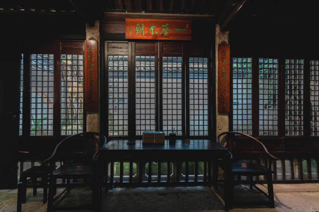 前室中間正上方掛有明代書畫家陳洪綬手書的“青藤書屋”匾,下方為徐渭的自畫像。畫像邊有對聯“幾間東倒西歪屋,一個南腔北調人”,上聯講的是徐渭晚年生活的清苦,下聯是對自身的藝術寫照。西側墻上掛有隸書匾對聯“牽蘿補屋王玉瑛,因樹作堂陳老蓮”。在朝南窗戶上方的“一塵不到”匾,為徐渭手跡。對聯“未必玄關別名教,須知書戶孕江山”,上聯的“玄關”,指居室外門。全聯意是:庭院的外門未必能隔絕名聲與教化,要知道小小書屋能包容天下江山。由此可見徐渭高雅的情趣和非凡的抱負。