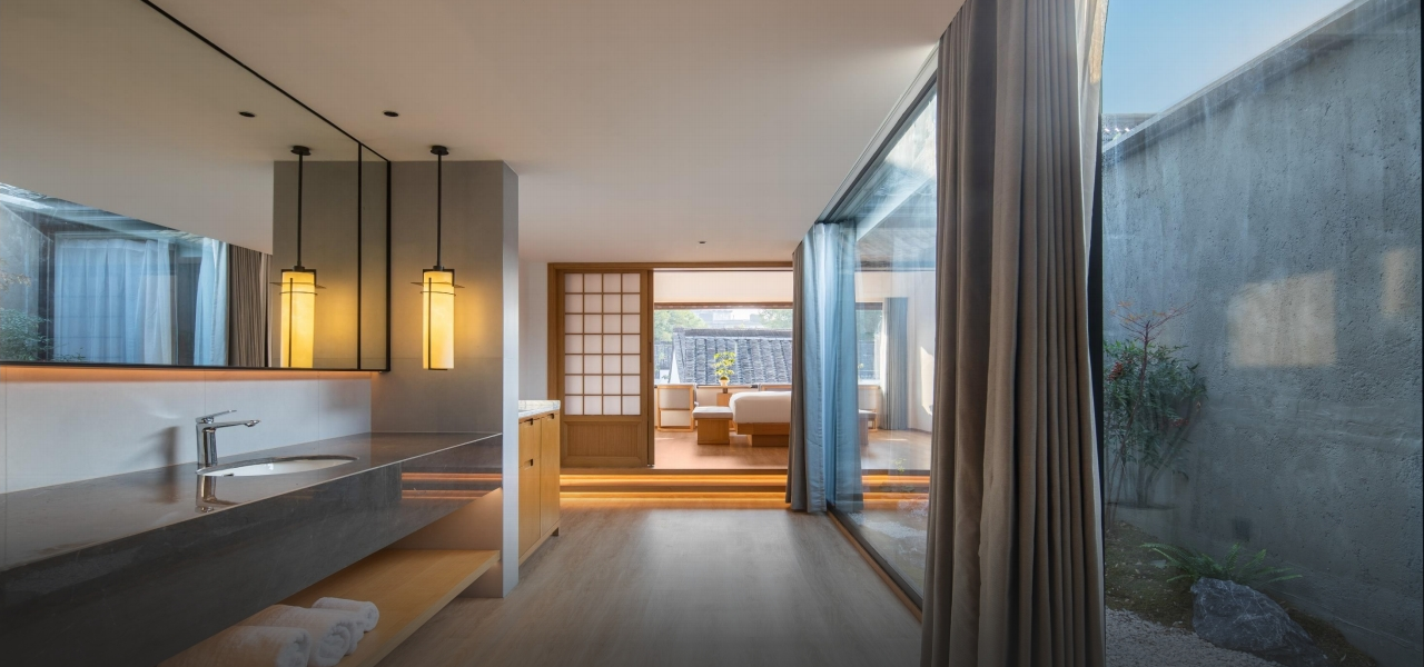 青藤別苑位于紹興市越城區(qū)后觀巷35號(hào)(徐渭藝術(shù)館西側(cè)),是具有徐渭文化特色的主題酒店。整體建筑面積780平方米,分上下兩層,主要經(jīng)營(yíng)住宿服務(wù)。酒店設(shè)有八個(gè)不同類型的房間,套房主題分別為渡海、眠松、行吟、行舟、對(duì)弈、扶醉、漁者、菊石、觀棋。入住其間,隨處可見(jiàn)文人筆下紹興人文風(fēng)物的靈秀。酒店還采用 “奪得千峰翠色來(lái)” 的越窯青色為局部墻體上色,營(yíng)造出溫馨放松的居住環(huán)境。客房古樸清雅,干練的空間線條、高級(jí)的材質(zhì)以及藝術(shù)化的裝飾,都以低調(diào)的設(shè)計(jì)展現(xiàn)著空間的本質(zhì),讓賓客在休憩之余能感受到古今韻味的自然連接,筆墨流轉(zhuǎn)間彰顯臺(tái)門(mén)禮序,簡(jiǎn)筆勾勒中續(xù)寫(xiě)江南古韻。