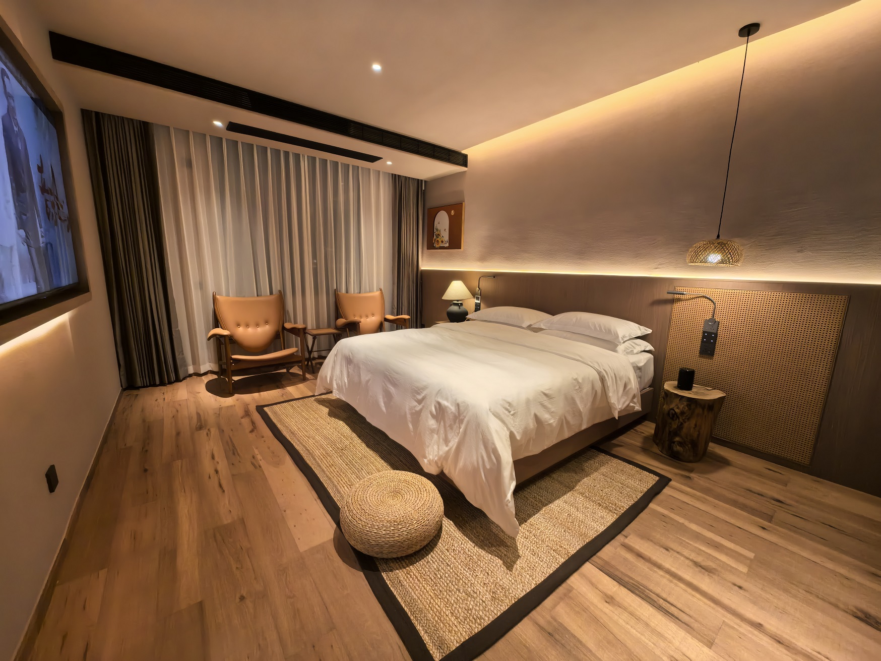 酒店由21棟民居整體設計裝修而成,客房涵蓋標間、大床房、親子房、主題房等