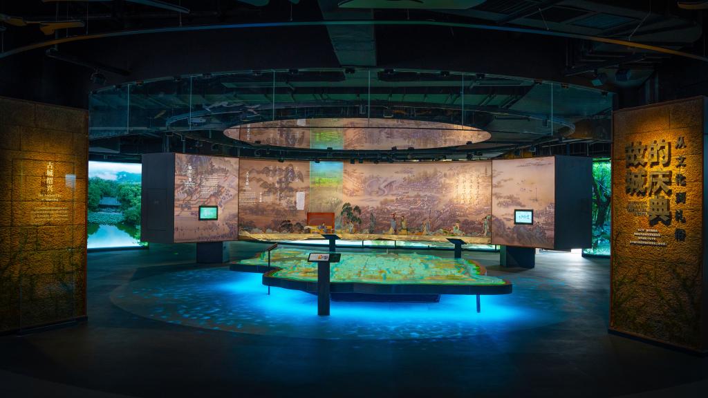 紹興古城位于北緯30°線上,展廳內(nèi)由古及今地展示紹興這座歷史古城。紹興,作為全國著名的“水城”,它緣水而起、因水而興、以水而名,千年故往與水有著不解之緣。展廳陳列以“水脈”為血肉,串聯(lián)起這座古城所有的故事