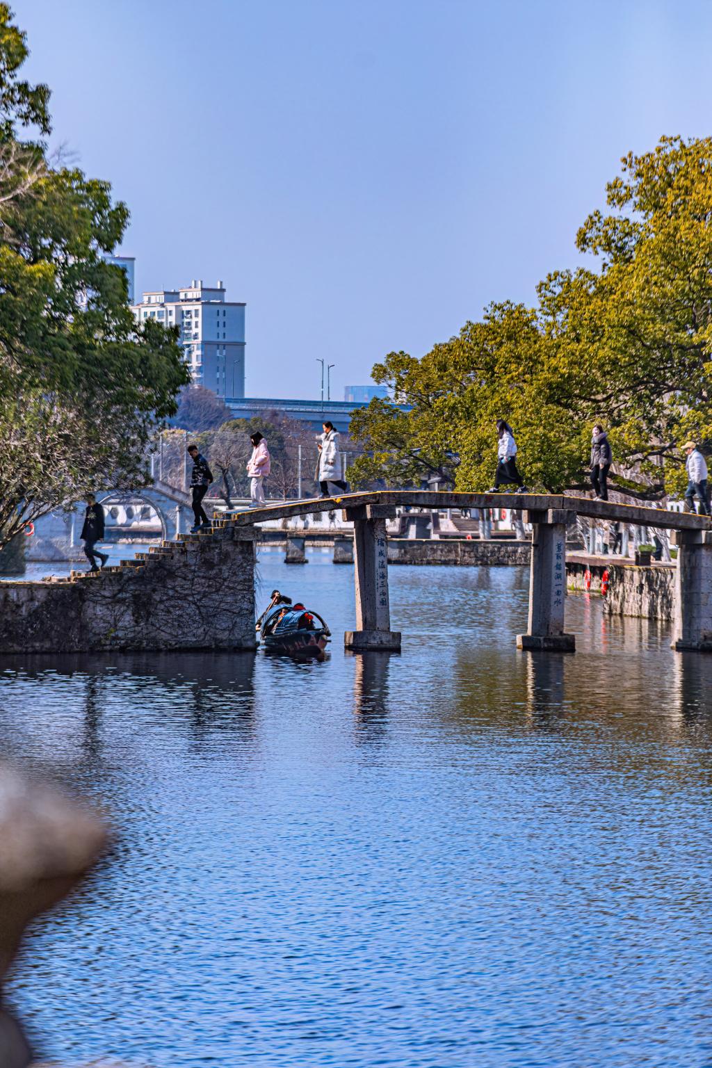東湖最別出心裁的石板橋是“霞川橋”。此橋一改紹興石橋---大腳圓拱的款式,采用板墩板橋,輕靈簡潔。橋下兩個板墩、三個橋孔將湖水分成三行,小橋在晚霞映照下會隱約在平靜的湖面上映出“川”字,“霞川橋”就是以這份意境而命名的。橋兩側為楹聯一副:“剪取鑒湖一曲水,縮成瀛海三山圖”。主人把東湖比作《山海經》傳說中的三座仙山,蓬萊、瀛洲、方丈,自豪之情由此可見一斑。