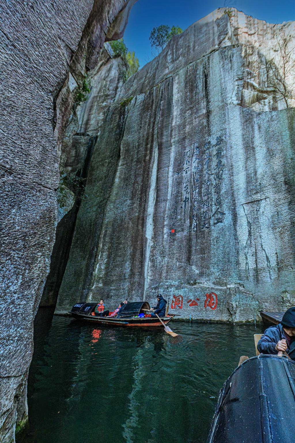 陶公洞是東湖最經典的三洞之首,也是最具特色的核心景點。洞內水面距離山頂47米,距離湖底18米,好像一口天然巨井,更似一口扣水巨鐘。當小小的烏篷船悠悠駛入洞穴,越往前行,陽光越淡,回望來路,曲曲彎彎,巖壁深深淺淺,與洞口的一線陽光融合。洞口摩崖石刻是一首四言詩,為1962年郭沫若先生秋游東湖時有感而發:“箬fen(第二聲)東湖,鑿自人工。壁立千尺,路隘難通。大舟入洞,坐井觀空。勿謂湖小,天在其中。”全面概括了東湖及陶公洞的特色。