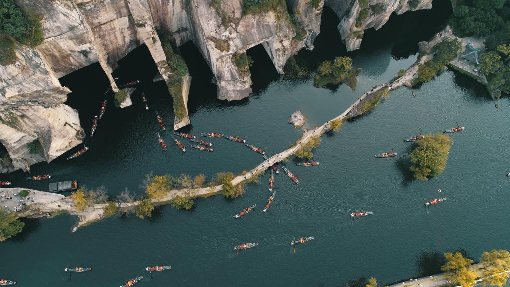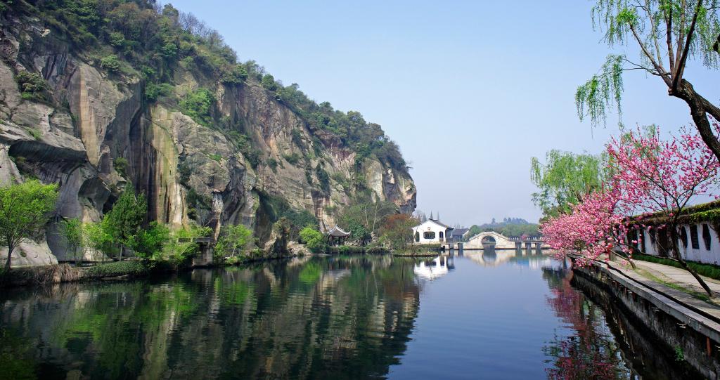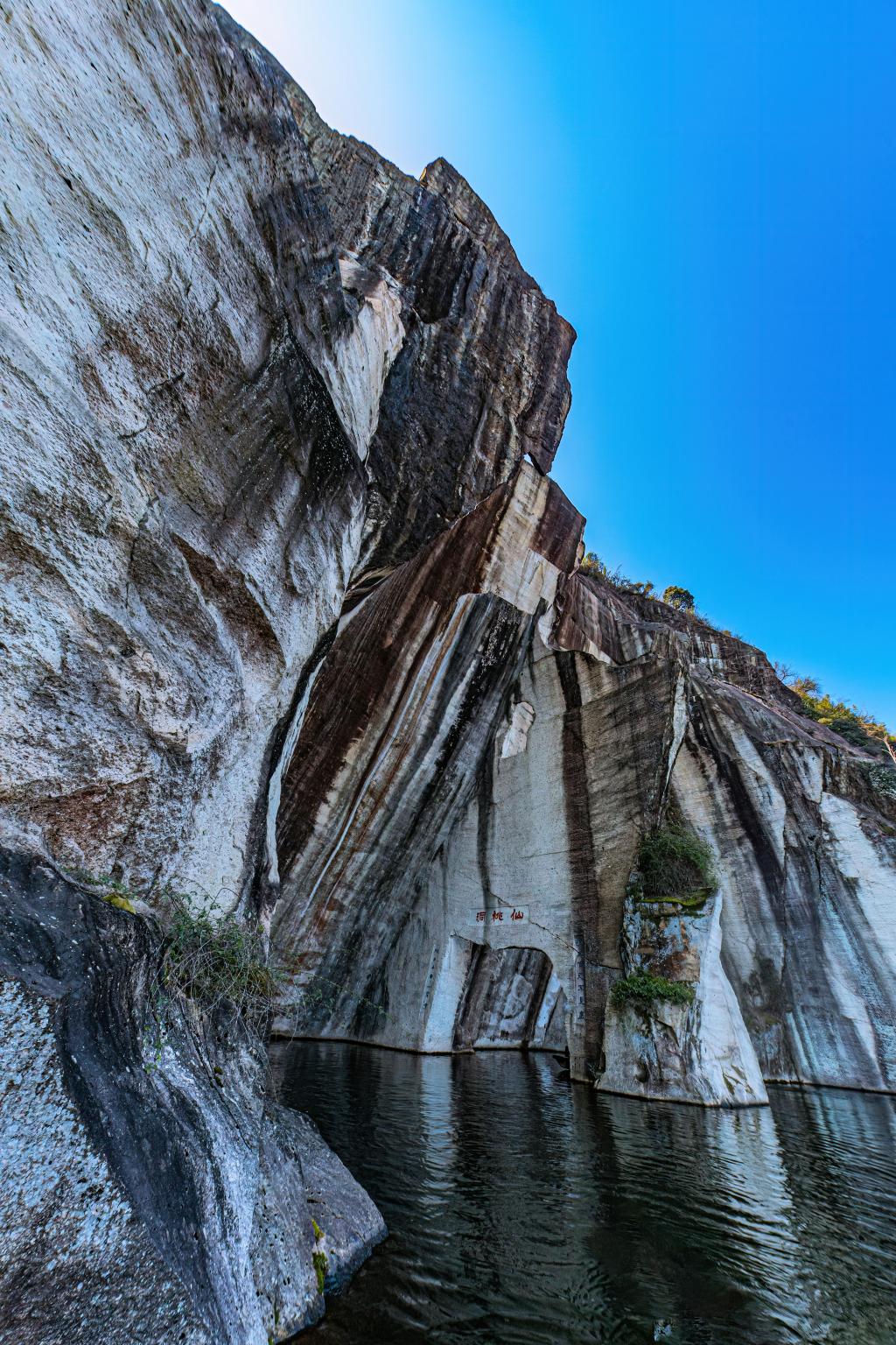 ? 東湖的采石遺跡別具特色,有三洞最為神奇。三洞之一“仙桃洞”因洞穴形似半個桃子、山石色澤粉紅而得名。洞穴位于石壁之間,是工匠們采石遺留的痕跡,雖鑿自人工卻宛若天開。此洞在山中,洞能通船,洞中有門,十分神奇,厚度不到1尺的石壁中間竟鑿有一扇寬約兩米的石門,它呈90度懸掛在山崖邊,最薄處厚度僅有10厘米。石門貫通了兩個原本不相連的石洞,使得湖洞相連,烏篷船可以從容穿梭于石門間