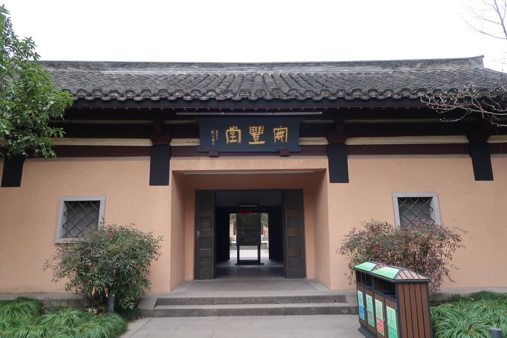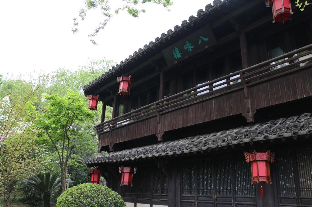 六朝井亭是唐、五代、宋、明、清的亭閣、磚井、池塘和假山等建筑遺址多處,是沈園悠久歷史的實物見證。“六朝井亭”亭內(nèi)有古井一口,此井亭中間可以望到天空,亭頂中空,可以使井承天露,象征詩人覆水欲收的意愿。中空“承天光”,解決雨水活性和采光。使人們從中體現(xiàn)向往婚姻光明自由的愿望