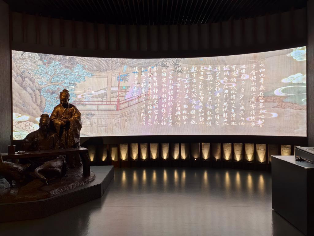 王羲之是東晉時期著名書法家。永和九年三月初三,王羲之與謝安、孫綽等41位名士在蘭亭修禊,曲水流觴,飲酒賦詩,乘興寫就了被譽為天下第一行書的《蘭亭集序》,他因此被后世尊為“書圣”,紹興也有了“書法之鄉”的美譽。以雕塑情景再現、電子屏滾動播放、觸屏書寫互動等形式,再現蘭亭雅集盛況