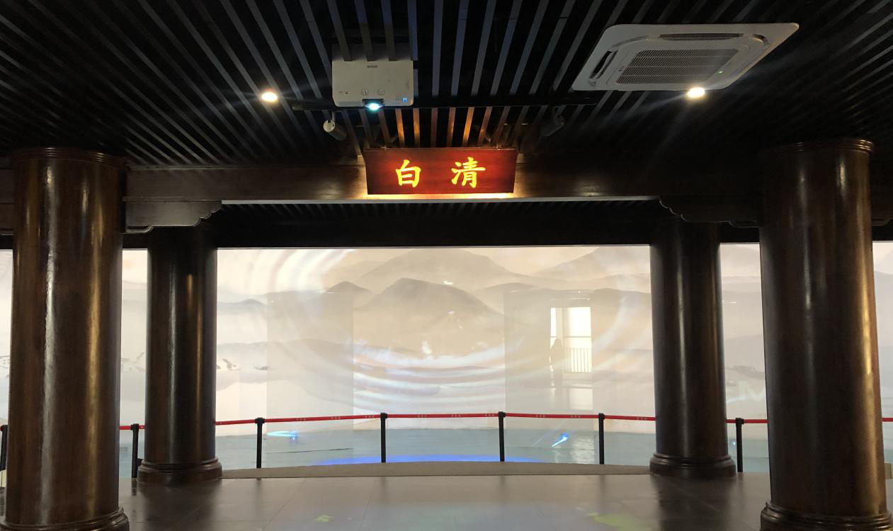 紹興清廉館序廳是以“清白堂”的建筑元素所設(shè)計,正前方掛有“清白”匾額。稽山鑒水的背景圖,連綿盛開的蓮花,寓意著紹興是禮儀之邦、清廉之地