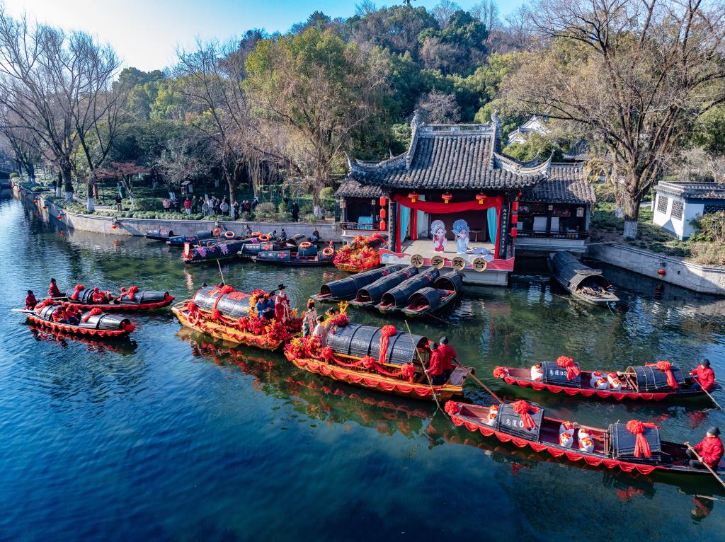 在魯迅故里、城市廣場水巷,開啟一場老紹興水上迎親巡游,伴隨著熱鬧的鑼鼓、喜慶的嗩吶,新人攜手一起跨火盆、過馬鞍、挑蓋頭、拜天地、許誓言,向大家分撒喜糖。在鼓樂聲中,一對新人坐著烏篷水上巡游,將浪漫演繹到極致。圍觀群眾可以加入迎親的船隊,沾沾新人喜氣。新人在眾人的祝福中完成一場傳統水上婚禮,攜手開啟幸福人生。